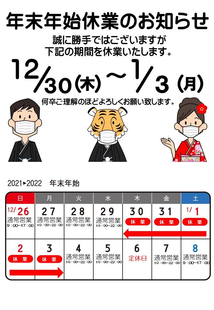 12月30日(火)~1月4日(日)まで休業